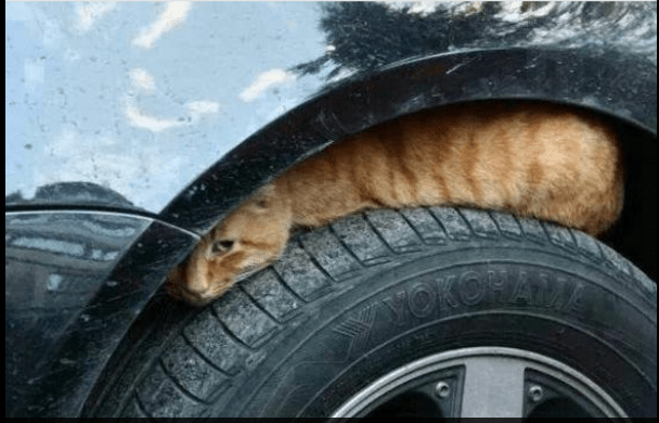 Den här katten åkte i motorhuven inte på hjulet som katten på bilden. Tur för den.