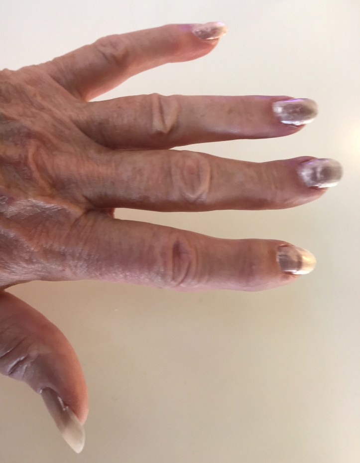 Tog bild av dem och blev ganska förskräckt över hur det såg ut på bild, kändes som det såg bättre ut när jag inte hade dem på bild. Såg ju också att till och med mina händer känner sig gamla, men det har nog inte med lösnaglarna att gör.