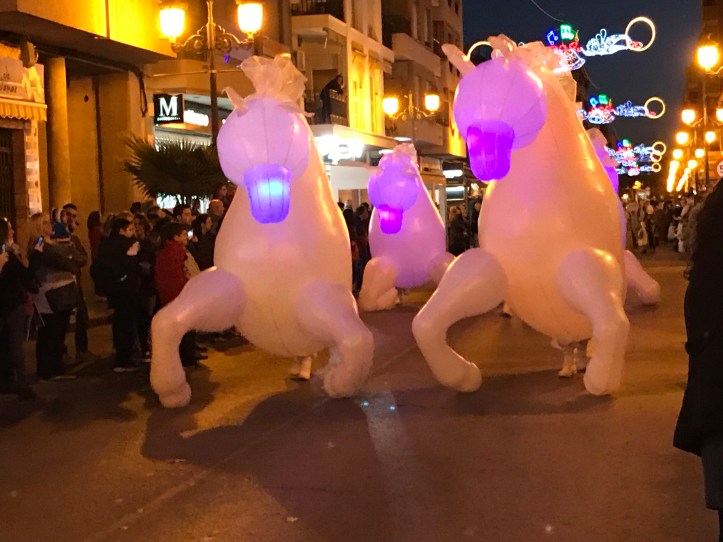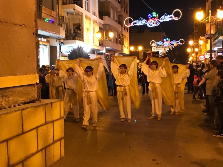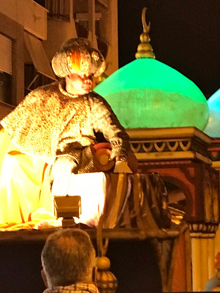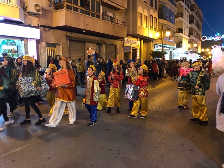Klockan 17:30 igår läste vi om att de 3 vise männen kom med båt till Torrevieja och sedan skulle gå i procession genom staden. De skulle alltså anlända klockan 17:30 och det är en halv timmes körning till Torrevieja och samtidigt var inge klädd. Likväl så kom jag och min svärdotter på idén att vi skulle åka dit. Tänk bara 2 tonårstjejer som brukar ta en timme på sig för att sminka sig, 2 något motvilliga lite äldre killar och så vi 3 som måste kallas vuxna och förståndiga. Men det var vi som kom på tanken. Jag hade shorts och valde att inte byta om, det var ju bråttom. Jag stod bara och tjatade om att ni kör vi, nu kör vi. Tjejerna hann att byta om och såg väldigt eleganta ut redan efter 10 minuter. In i bilen alltså, vi var 7, bilen är gjord för 5. Ni kan tänka er hur det såg ut. Två eleganta tonårstjejer i kofferten. Helt klart olagligt. Men vad gör man. Iväg. Vi körde inte så långt förrän vi såg att vi inte skulle hinna. In i den närmaste större by istället. Kunde ju passa på att äta. Där möttes vi av en procession som skulle starta. Det började att bli lite kallt och mörkt och tjejerna kom på att de inte hade hunnit att ta på sig jackor. De frös, men min gentlemannason lånade ut sin jacka, så han frös istället och tjejerna såg ut som siamesiska tvillingar. Att se processionen var jättefint. De dansade och sjöng och kastade ut godis till barnen som var beväpnade med stora plastpåsar att samla upp godiset i. Vi avslutade med att äta på en Kinarestaurang. Jag fick komma in till trots för min något avklädda skepnad. Jag hade i alla fall hunnit få på mig en jacka. Såg kanske lite konstigt ut. Jacka och shorts.