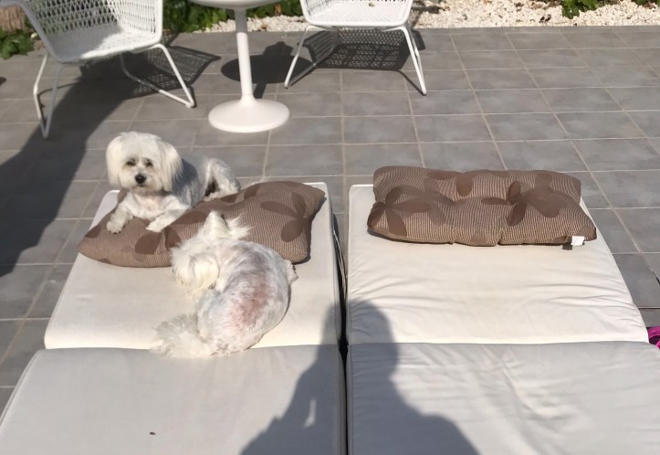 Men alltså det är verkligen fint väder nu att sola i. Kanske det bästa vädret i Spanien om man vill sola. Graderna på termometern går inte över 26 grader ännu och då kan det vara uthärdligt att ligga i solen, speciellt om det är lite svalkande vind också. På sommaren när det går över 36 grader är det för varmt att ligga direkt i solen. Mina hundar tycker också att vädret är lämpligt att sola sig i vid denna tidpunkten, speciellt nu när de också är nyklippta. Så när jag lägger madrass på solsängen så hinner de inta den innan jag hinner lägga mig själv. Alltså måste jag nu ta fram två solsängar om jag skall få plats också. Jag måste också ha två kuddar, eftersom Pippi tycker att ju mjukare desto bättre. Hon intager kudden med en självklar äganderätt. Hon är ju likadan i sängen och helst skall kudden ha ett sidenöverdrag för att hon skall vara helt lycklig. Kan ju lägga sig på annat material också, men om hon får chansen att välja så vet ju jag och hon vad hon väljer. Har kanske blivit lite lik mig i det. Jag föredrar också sidenöverdrag. Det är så mjukt och skönt att sova på. Helst skall också kudden vara av siden. Då är det en dröm att lägga sig för att sova.