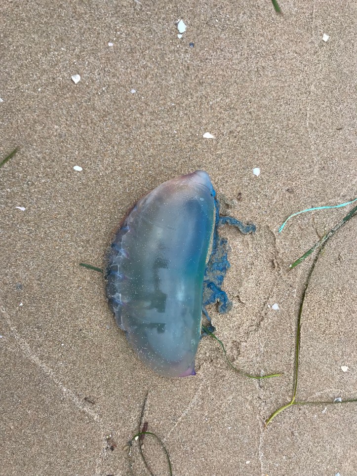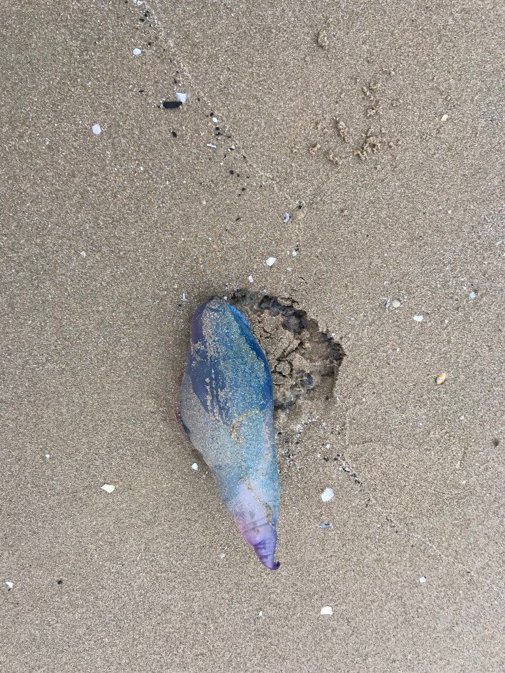 Är det någon här som vet vad portugisiska örlogsmän är? Själv trodde jag att det var någon form av sjömän från Portugal. Det är det alltså inte. Det är tydligen en slags maneter, som inte tillhör manetsläktet. Inte vet jag vilket släkte som de tillhör, men i Wikipedia står det i alla fall att de inte tillhör maneterna, utan något annat. Jag har hört att de hade synts på en närliggande strand till den jag tar mina morgonpromenader. Och därför förstått att de var giftiga, kan tydligen paralysera en helt så att man om man är ute och simmar så kan man riskera att drunkna. Och att de kan göra det länge efter att de är döda. Tentaklerna kan tydligen bli upp till 50 meter. Hur skall man då veta att man simmar bland örlogsmän om själva djuret är 50 meter ifrån en, men att man likväl kan bli paralyserad av deras tentakler. Nu låg dessa två uppspolade på stranden. Jag trodde först att det var en ballon, som hade väldigt vackra färger som skiftade i alla nyanser av blått. Tänkte faktiskt att känna efter på en innan jag insåg vad det var jag stod och tittade på. Då röt jag, ja, just RÖT till mina hundar att hålla sig borta. De blir ju också nyfikna när jag ställer mig och tittar på något. Hur farligt är det egentligen, de är ju inte precis ute och simmar i havet och har därför svårt att drunkna. Men kanske de kan bli paralyserade. Jag har inte hittat att man blir paralyserade i andningsvägarna och antager att det går över efter en stund, paralyseringen alltså. Så det värsta som kunde ske är kanske att jag fick bära några stela hundar till bilen, men antagligen hade de kunnat springa själv efter en stund. Men detta är bara mina hypoteser och har faktiskt inte en aning om hur farliga de är. Idag skedde dock inte något och jag såg inte till någon tentakel. Lade ut det på Face Book på La Marina sidan och har redan fått svar att jag borde anmäla det till myndigheten. Vilken? Och kan de prata svenska. Jag vet inte vad en portugisisk örlogsman heter varken på spanska eller engelska. Jag tror att jag avvaktar men anmälan. Det fanns ju många andra på stranden som också måste ha sett dem och kan prata spanska. Och om, vad gör myndigheten. Sätter spärrband runt stället där de ligger. Men det farliga är väl att det kan finnas väldigt många fler i vattnet. Kan man spärra av vattnet också och hur långt ut? Nu är det väl så att även om Medelhavet har badtemperatur enligt norska och svenska mått mätt. Alltså kring 18 grader, så är det i regel för kallt för någon att bada i Spanien. Finns dock någon frisk turist som vågar sig i vattnet, och också de där som går omkring med något kattliknande redskap ute i vattnet. Men de har alltid kläder på sig. Vet inte helt varför, kanske de är rädda för portugisiska örlogsmän. Jag har alltid undrat vad de egentligen gör ute i vattnet med de här konstiga redskapen som de trycker djupt ner i sanden. När jag har lärt mig spanska så skall jag fråga. De har en plastpåse bundet kring midjan, där de lägger något som jag inte har klarat av att se. Kanske ätliga snäckor? Varning!! Ät inte de där små musslorna/snäckorna som de ibland bjuder på vissa tapasrestauranger. De smakar bara sand.