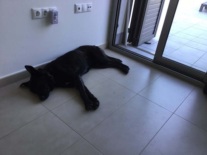Ja, på Facebook stod det för någon dag sedan om en hund som en svensk tjej hade räddat i sista minuten från att bli avlivad. Men hon måste ha någon som ser till den i en månads tid. Jag tänkte att det kunde jag nog ställa upp på. Är inte helt säker på vad jag hade väntat mig. Först var det en annan som skulle ta honom, för det är en honom. Denne någon satt delvis i rullstol tydligen, och självklart gick inte det. Jag har verkligen behövt både mina två ben och två armar för att klara av honom. Har snart fått blåsor på högerhanden. Detta är en väldigt aktiv och gladlynt hund som inte har fått lära sig någonting. Antagligen var det därför de hade satt ut honom på gatan. Han går gärna över bord eller på borden. Säker på att han äger allt han kan se.
