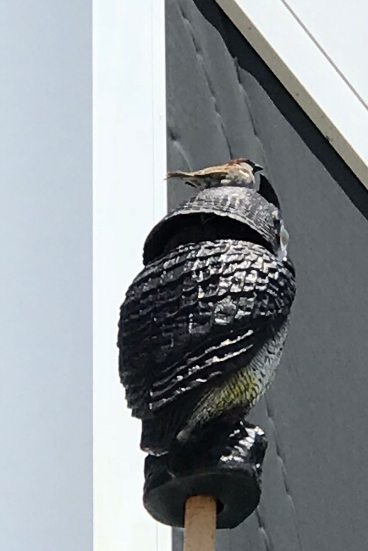 Ja, jag jagar fåglar. Jag som inte tycker om jakt, jag jagar fåglar. Med tennisbollar, fågelskrämmor, vindmöllor osv, osv. Till och med med med Fluffy. Henne har jag ju lärt att så fort hon ser en fågel skall hon reagera och försöka att springa efter dem, helst skulle jag lära henna att flyga. Jag är säker på att hon i så fall hade flugit omkring ständigt och jagat iväg fåglarna. Visst är det fint med fågelsång, men fågelbajs är inget vidare. Det är inte heller så kul att så fort mitt stora glasparti är helt öppet så har jag dem inne i huset. Det är faktiskt inte så lätt att visa dem vägen ut. Hur många gånger de än flyger in i väggen så lär de sig inte att de inte kommer ut den vägen eller genom ett stängt fönster. De är inte vidare intelligenta. Men de överlistar likväl mig i min jakt på dem. Speciellt är min överbyggnad över altanen däruppe utsatt av fåglar. Där ligger nakna lik av fågelungar, krossade ägg och fjädrar, fjädrar och åter fjädrar. För att inte prata om fågelskit. Jag skurar golvet, knäskurar det men nästa dag är det igen fjädrar och fågelskit. Vad göra. Ja, klart köper man en fågelskrämma. Har köpt en Uggla som vrider på huvudet i vinden. Det fungerade delvis i början, men efter ett tag har faktiskt fåglarna förstått att den bara sitter där, så nu använder de huvudet på fågelskrämman som sittplats istället. Hörde då at någon menade att vindsnurror var effektiva mot fåglar. Köpte vindsnurra. Ja, de satte sig alltså inte på vindsnurran, eller i närheten av den, men på alla andra ställe. Jag köpte alltså fler vindsnurror och större. Satte upp dem lite överallt däruppe. De lärde sig då också ganska snabbt att de inte var så farliga och sätter sig nu väldigt nära dem utan att verka att skrämmas alls. Skall jag ge upp den omöjliga kampen och kanske istället börja njuta av fågelkvittret. Klarar dock inte av att övertala mig till det. Har börjat kasta tennisbollar efter dem för att skrämma bort dem med resultatet att jag nu har en tennisboll fastkilad vid markisen. Den får jag inte bort. Och fåglarna bryr sig inte. De har klart bestämt sig att till trots för mina ansträngningar att visa för dem att de inte är välkomna, så har de tydligen bestämt sig för att mitt hur är det bästa stället här i närheten. Jag tror att de tror att jag har satt upp vindsnurror och fågelskrämmor mest för att skapa intryck av ett fågeltivoli. Fåglarna verkar till att tycka att det bara är skoj.