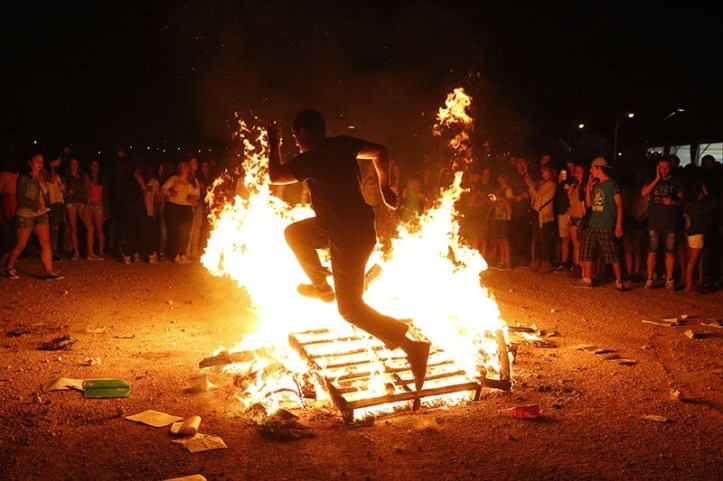 Väl på stranden var det så fullt med bilar på parkeringen att vi fick köra tillbaka och parkera en bit därifrån och gå ner. Ja, helt klart något pågick på stranden. Eldar överallt, massa människor som hade riggat upp bord, stolar, högtalare och eldar. Konstigt att inte någon eller något började brinna som inte skulle brinna. Hög stämning med eldgnistor flygande i alla riktningar. Det var nästan så att man var lite försiktig med sina kläder. En gnista kunde lätt flyga mot en. Vi stannade inte så länge, mitt barnbarn började bli sömnig efter en varm dag i solen med jobb. Vi såg alltså inte när de badade, vilket jag har lästa att man gör klockan 24:00 prick. Man går baklänges ut i vattnet och prick klockan 24:00 och när man kommer upp ur vattnet så skall man hoppa över 3 små eldar för att skaffa sig tur och lycka resten av året. Men vi märkte i alla fall av fyrverkerierna klockan 24:00 även hemmavid. Till och med grannarna här skickade upp raketer till hundarnas förtjusning. De började skälla och ville nog in till grannarna och ta raketerna.