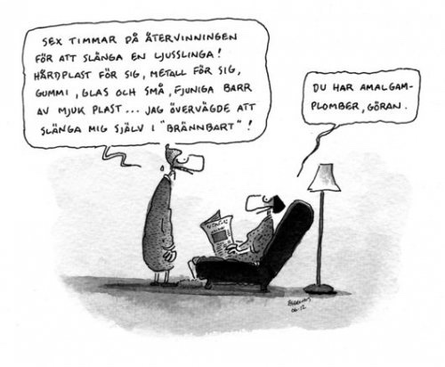 Jag försöker att göra det, men i viss mån håller jag mig till reglerna om sopsortering. Mycket lättare här i Spanien. Här sorteras en del plast, glas och kartonger. Allt annat går i ett och samma avfall. Det är faktiskt helt nog för mig. När jag börjar tänka på saker som är gjorda av olika material och som skall klippas, skruvas dras ifrån varandra för att kastas i olika kärl så blir jag förvirrad och också lite förbannad. Helt eniga med att man kan sälja saker utan att förpacka dem i inbrottssäkra förpackningar. De flesta har kanske försökt att öppna färgpatroner till en skrivare, det är inte lätt. För att inte tala om förpackningar av batteri, leksaker och allt annat. Nu är det kanske så att batteri och färgpatroner nog inte heller är så där helt vänliga mot miljöen. Så ett alternativ är att sluta tillverka dem. Men om vi nu fortsätter tillverka dem så får de gärna för min del säljas i förpackningar som man med lätthet kan öppna utan att använda saxar och skruvmejslar. Det skulle göra mitt liv behagligare.