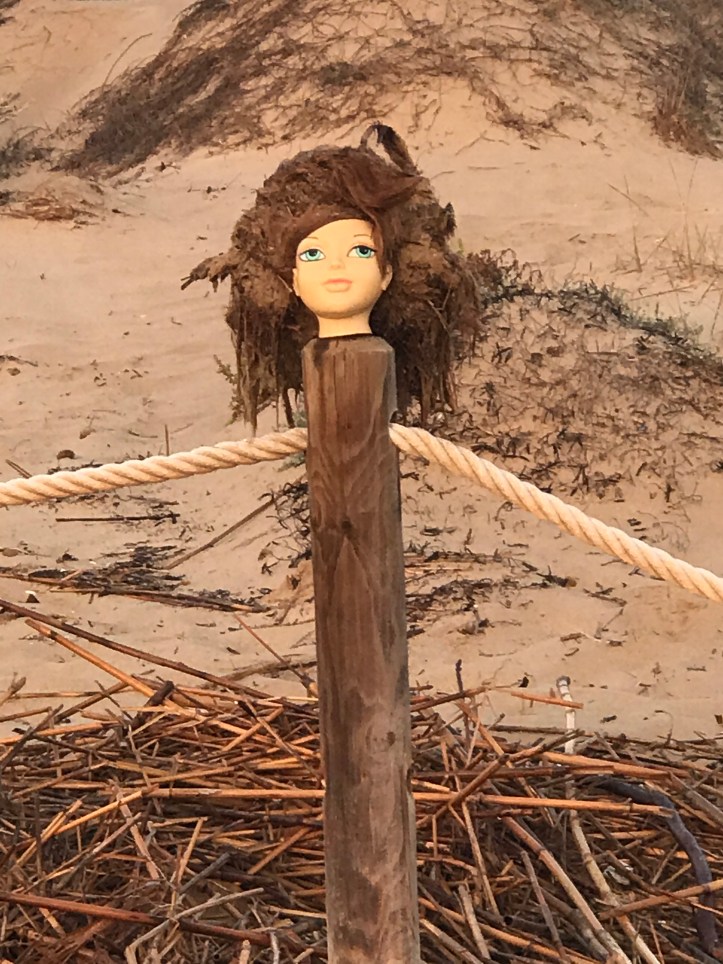 Så imorse var det dags för min strandpromenad. Hundarna blev så stimmiga när de förstod att de skulle få åka bil nu på morgonen istället för att bara gå runt här i La Marina. De lät hela vägen ner till parkeringen på stranden. Pippi hoppade ut ur bilen så fort jag öppnade dörren. Fluffy var strax efter. De kände verkligen igen sig. Gick hela vägen ner till stranden och tänkte att jag behöver inte gå så långt idag på stranden, det är ju nästan 1 kilometer ner till stranden från bilen, så jag skall ju inte överdriva första dagen på flera månader. Hundarna blev ännu lyckligare när de väl kom ner till sanden och sprang glada omkring. Såg inte en människa där och njöt av utsikten, vatten, sand och en sol som började skymtas bak molnen. Det låg förvånansvärt många döda fiskar på stranden. Undrade om det var på grund av översvämning och annat som hade kunnat medfört det. Kan ju också vara andra saker, ingen aning, men många döda fiskar i alla fall. Fluffy försökte kissa på allesammans i början, men hon gav upp. Hon har ju för sig att om det ligger något annat än sand på stranden så måste man kissa på det. Ja, bara några droppar, men verkade som om dropparna också tog slut. Jag koncentrerade mig på sättet hur jag går. Försökte låta bli att halta. Fick visserligen likväl mer och mer ont i mina höfter, men inte i hälsenan. Yippiii. Jättebra. Stranden hade hämtat sig efter översvämningarna och gick fint att gå på. Gick ca halva den vanliga vägen som jag brukade gå. Då vände jag, höfterna värkte och vaden började krampa. Såg också ett dockhuset uppspretat på en pinne. Såg ganska makabert ut, efter att jag har suttit och sett på Roma på TV:n. Där spettade de upp huvuden på pinnar efter halshuggningar som ett varnande exempel. Vet inte helt om det var lika illa med dockhuvud. Kändes dock lite bättre än om det hade varit ett riktigt huvud. Tog ett foto av huvudet i alla fall.
