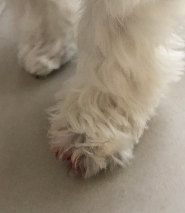 Jaha är det inte det ena så är det det andra. Gick precis eftermiddagspromenaden med hundarna innan jag skulle göra mig iordning för att fira halloween. Klädde mig, är ju inte speciellt presentabel för att visa mig bland folk när jag går här i min ensamhet bakom murarna. Fick koppel på hundarna. Både brukar vara väldigt ivriga över att komma ut och gå. Inte Fluffy idag. Hon närmast kröp framåt, jag hejade på henne och försökte locka henne framåt, men hon gick väldigt långsamt, såg lite lidande ut. Förstod efter ett tag att något måste vara fel, började tänka om hon hade fått i sig något olämpligt på stranden idag så att det var hennes tur att bli sjuk idag. Hon såg lidande ut, men inte sjuk. Hon gick långsamt, satte ned tassarna försiktigt men kunde inte se att hon haltade. Men undersökte tassarna i alla fall. Då fick jag en hel klo i handen. Hon hade fastnat någonstans med sin klo och rivit av den nästan. Inte helt eftersom jag fick den i handen när jag undersökte hennes tassar. Jag bar henne tillbaka. Visserligen skall hon inte väga mer än 4,5 kilo eller något sådant, men det blir tungt att gå med henne en längre bit. Jag hade ju varit envis så jag hade ju dragit henne med mig en bit. Pippi såg lite besviken ut över att vi inte skulle gå lite längre. När jag kom hem så ser jag att det är blodbad vid grinden. Någonstans där måste hon ha fastnat, även om jag inte kan se att där finns något att fastna i, men blodet kunde jag se. Nu ligger hon bara väldigt stilla och rör sig inte alls. Tur att jag hade bestämt mig för att köra hem ikväll och inte ta med hundarna på halloweenfesten. Jag tror inte Fluffy hade uppskattat det och jag tror att strandpromenaden imorgon är inställd.