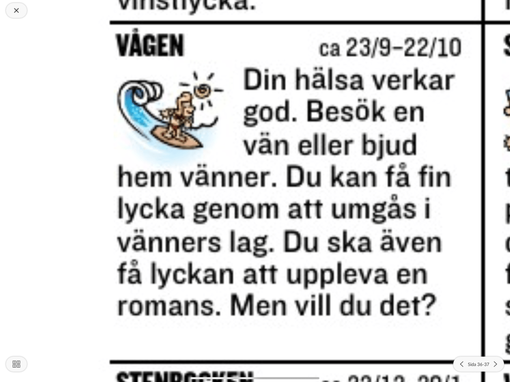 Ja, jag tror att min hälsa är god och det skulle ju vara trevligt att besöka en vän eller bjuda hem vänner. Men…. Ett stort men, det är faktiskt inte tillåtet att göra det. När det gäller romansen så ställer horoskopet frågan om jag vill det. Nej, det vill jag inte och kommer helt klart att slippa att bli utsatt för någon frestelse åt det hållet. Inte ens min mycket gifta bassängstädare dyker upp nu. Han är säkert förbjuden att utföra sitt jobb under den här tiden. Vi kommer väl till att få pooler som är fulla av skit och kanske en del bakterier också. Kan man dö av en skitig pool. Troligen. Det finns många utmaningar. Nu är det ju så att jag fortfarande inte har löst problemet med motion. Min syster föreslog att jag gick runt bassängen med hundarna så att både de och jag fick motion. Men hur många varv måste jag ta. Det är lite trångt på ena sidan om poolen så risken är att jag trillar i, i den inte helt rena bassängen. Slår jag dessutom i huvudet när jag trillar så kanske jag kan dö drunkningsdöden istället för isoleringsdöden. Spanien har annars helt gått ned för räkning, inte ens vädret är som det skall vara i Spanien. Den ena dagen efter den andra med kyla och grå himmel. Det är kallare och solfattigare nu än vad det var i januari och februari. Ja, man skall ju helst hålla sig inomhus likväl, säger polisen. Det sprids mycket dålig information på FB. En sådan var att man nu inte heller fick sitta på sina balkonger. Varför vet jag inte, när man dessutom vet att det inte är lika lätt att smittas utomhus som inomhus. En annan sådan information är att man bara får åka en och en i en taxi. Det måste nog bero på att taxiföretaget skall överleva. Annars är det väldigt konstigt att ett par får lov att sova i samma säng, men inte sitta bredvid varandra i en taxi. Men klart informationen som sprids på nätet är inte alltid så tillförlitlig, så ta det med en nypa salt. Många tycks också nu hoppas på ett vaccin. Ja, det vore bra men den expertisen som jag lyssnat på menar att det kommer att ta mer än ett år innan ett vaccin är färdigutvecklat. Alltså jag orkar i alla fall inte sitta inlåst i ett år, då hoppar jag hellre i sjön. Nej, visst jag kommer ju inte ner på sjön. Den kan man bara titta på numera i Spanien, inte komma dit. Kanske smittospridningen går snabbare i sand och i vatten, även om experterna inte har förstått det. Bara de som tycker och tänker utan att bry sig om experter. Det finns faktisk många av dessa. Lite kul att förstå att folk tror att viruset försvinner om vi inte träffar varandra. Ett virus som försvinner vore att inleda en ny vetenskaplig era. Det är ju faktiskt så att varken SARS eller ebolaviruset har försvunnit, men vi har fått lite bättre kontroll över det. Influensan återkommer ju varje år också och skördar en del dödsfall. Men inte fler än vad sjukvården orkar med. Det är väl det vi jobbar med just nu. Sprida ut sjukdomstillfällen för sjukvårdens skull, kanske inte för att rädda liv, men ge sjukvårdspersonalen en möjlighet till att hänga med.