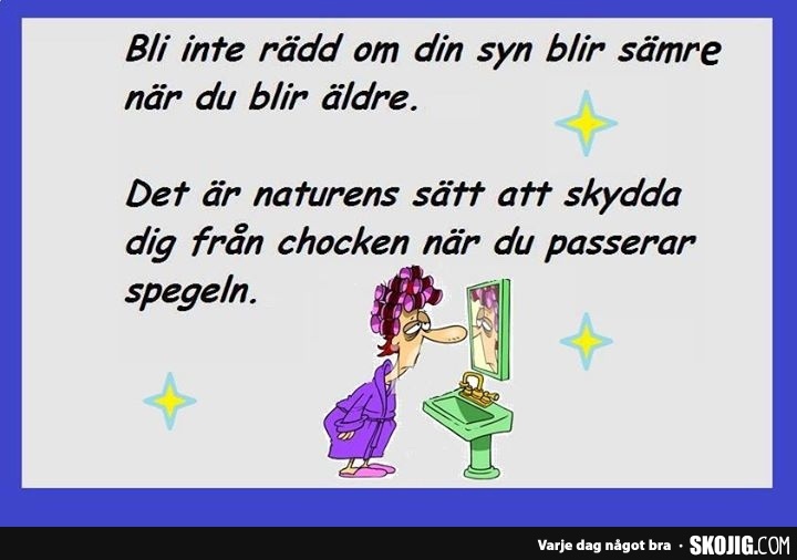 Det har ju också blivit så att vi som är över 70 år inte vill bli påminda om att vi är det. Av en eller annan anledning så vill vi inte höra talas om att vi tillhör de äldre. Kanske de över 100 år tillhör de äldre, men absolut int vi. Hur kom det sig att någon trodde att vi var gamla. Själv minns vi ju klart och tydligt när vi var barn och så fort kan det ju inte ha gått att bli äldre. Om jag är 2 år och blir 3 år så har jag ju också blivit äldre, så varför skall man prata om det när man är över 70 år. Jag skall prata tyst om att ju äldre jag blir, ju bättre minns jag när jag var barn. Min far gjorde likadant och han blev ju nästan 106 år. Han kanske var lite äldre, men inte så mycket. Vem vet om vi utrotar alla sjukdomar så lever vi kanske för evigt. Inte säkert att vi minns att vi är äldre då heller visserligen, om man nu inte har utrotat alla demenssjukdomarna också. Men det kanske man har. Har man det inte så minns vi ju kanske inte att vi har blivit äldre.