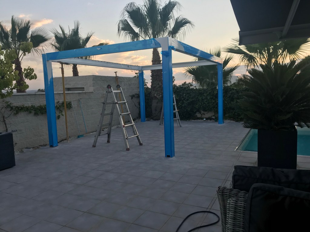Men alltså min pergola är under framväxt. De har nu jobbat med den sedan i tisdags och hundarna har alltså varit inlåsta dagtid sedan i tisdags. Just nu håller de på att koppla strömmen. Skall ju vara belysning, elektrisk vinkling av taket, koppla in infravärme och elektriska uttag. De var alltså tvungna att komma in och slå av strömmen. Tror ni inte att Fluffy nafsade den ene av dem i hälarna. Ja, hon har ju inte blivit så väldigt lycklig över att ha dem här när hon bara får titta på dem genom glaspartiet. Han blev inte glad, visserligen så klarar hon ju inte av att bita hål, men det verkar inte som att någon uppskattar hennes kontaktförsök med deras hälar. Kan ju delvis förstå dem.