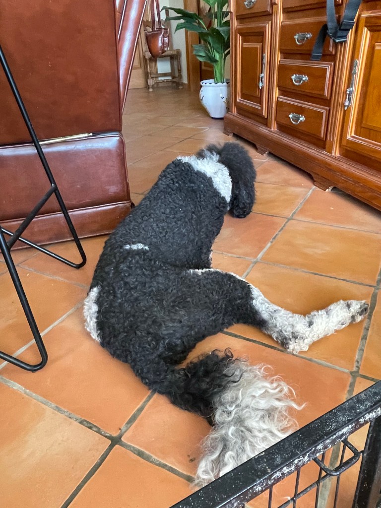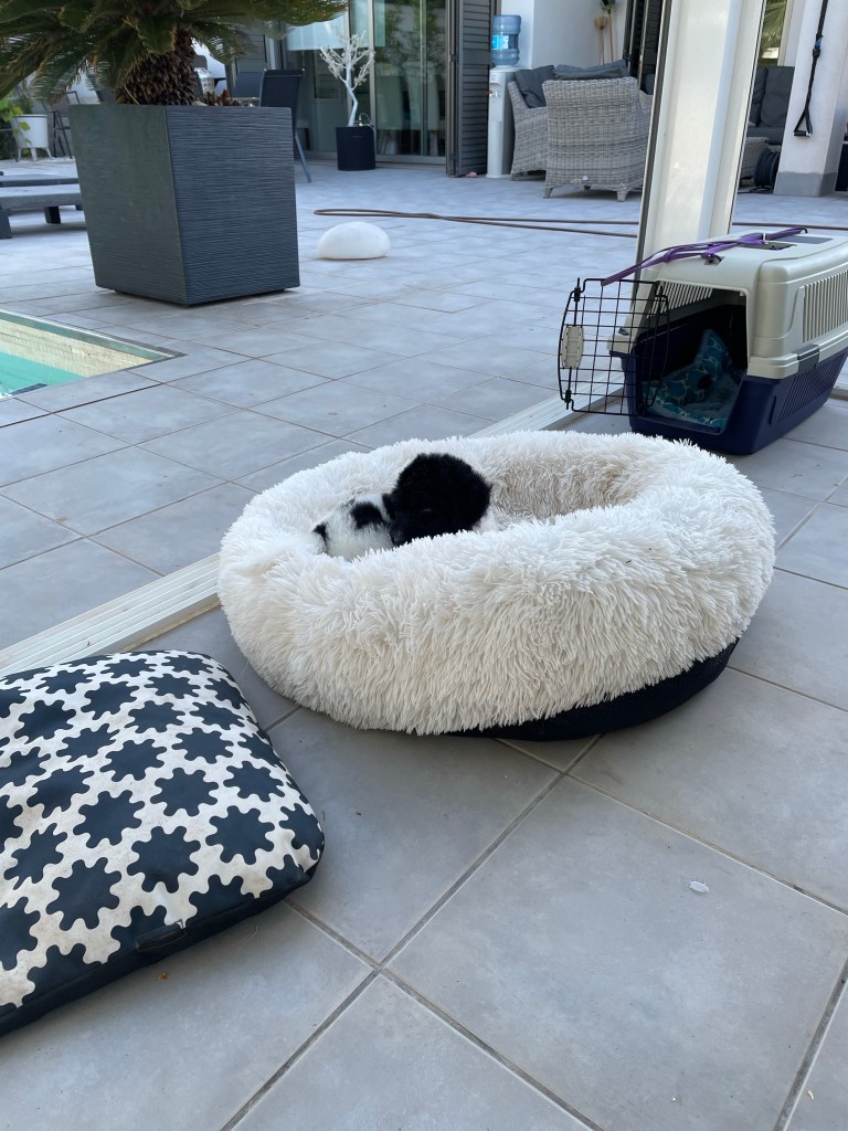Dagen gick till lek, sömn och mat som sig bör med en liten 8 veckors valp. Mat tycker hon om, växer kanske fort. Hon skall ju bli en stor kungshuset, svart och vit. Ganska ovanligt i Sverige och Norge men inte här i Spanien. Kallas harlekinfärgad. Fluffy markerade mer och mer allvarligt till henne att hon inte var en leksak. Verkade inte som om budskapet gick in i den lilla valphjärnan. Tränade lite att gå i koppel med henne på tomten. Misslyckades totalt. Halsbandet som hon hade fått med sig från uppfödaren var så pass stort att hon lyckades få in det i munnen. Lite svårt att få av det från henne. Fick tvinga av det över henens öron så att hon slapp se ut som en häst med bett i munnen. Fick göra ett eget till henne som passade bättre i storlek. Är troligen för litet för henne om 14 dagar. Hon tyckte inte så där väldigt mycket om att gå i koppel. Men gick i alla fall kanske i 2 minuter. På kvällen tänkte jag att Fluffy och Pippi behövde gå ensamma utan henne så hon fick för första gången träna på att vara ensam hemma.