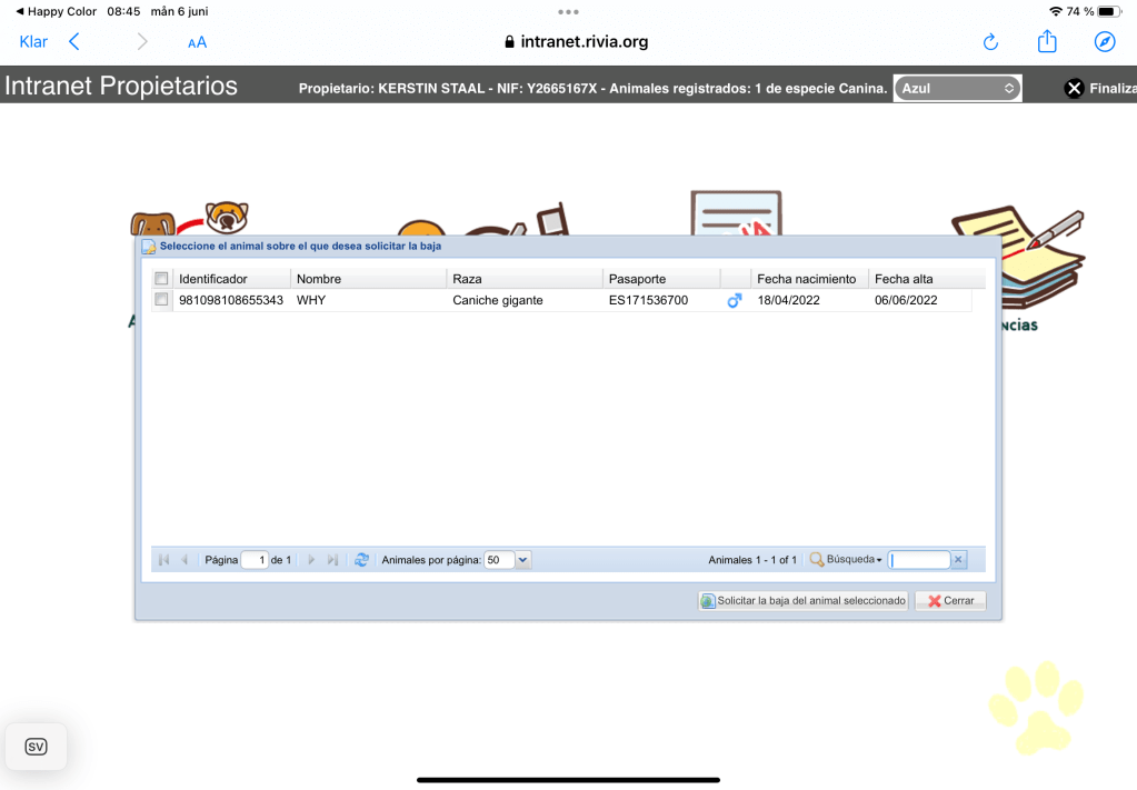 Ser ni vad jag ser. Blev ganska så överraskad. Alltså Why har fått sitt chip och jag har inte fått hennes pass ännu, men fått meddelande om att det är klart och gick in och tittade på det. Där står Fecha nacimiento, som betyder födelsedatum: 18 april 2022. I så fall är hon bara 7 veckor. Jag har fått uppfattningen att hon föddes 10 april och därmed var 8 veckor när hon levererades. 7 veckor var kanske lite tidigt att vara utan mamma och syskon. Dock hon verkar inte att bry sig.