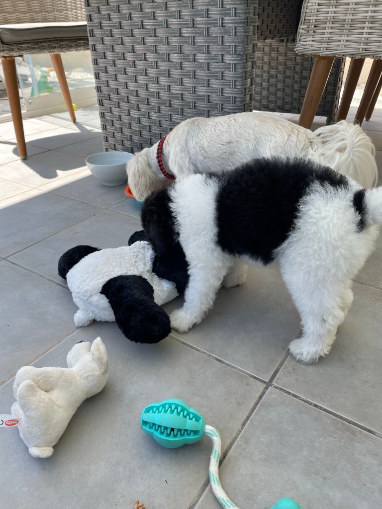 Jobbar också med att få henne att sluta bita sönder mina kläder och mina fingrar och tår. Köpte nya leksaker till henne. Hon behöver en bitning som liknar fingrar, men hittade ingen sådan. Fann en ny aktivitetsleksak. Ingen konst för henne att lösa den gåtan. Men oj, vad det går åt mycket godis som man skall mata leksakerna med. Kan nog inte fortsätta så. Kanske inte så bra för en valpmage att äta hundgodis hela tiden.