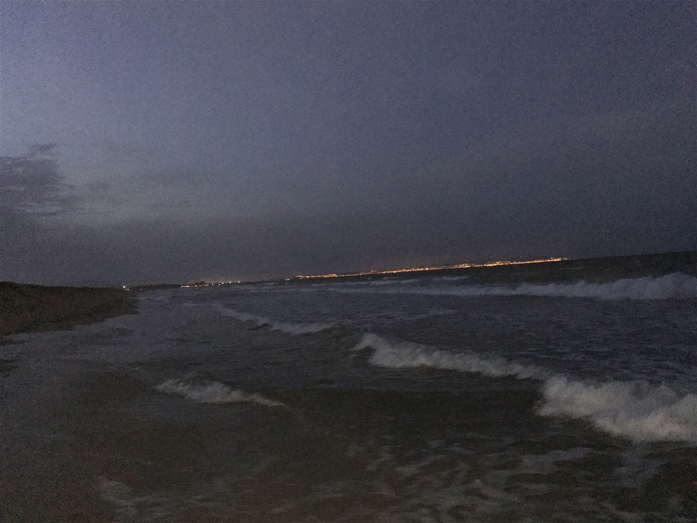 Det är en lyx att gå på stranden när man ser ljusen tändas i Santa Pola och Guardamar. De liknar en långt halsband av tindrande diamanter i fjärran. Havet skiftar från underbart turkos, till mörkare blått och slutligen till farligt, mörkt, hemlighetsfullt svart, medan vågorna uförtrötteligt rullar in med vitt champagneskum på toppen av varje våg. Ljudet av vågor, hav och människors dämpade konversationer låter lugnt och tryggt på något sätt. Lika underbart att börja dagen på stranden som att sluta den där. Tror dock att hundarna var lite mörkrädda. Fluffy sprang inte framför mig som hon brukar utan höll sig bakom mig. Hon väntade väl att jag skulle rädda henne från allt farligt som kunde lura i mörkret. Jag kan nog inte vänta mig någon hjälp av dem om jag blir angripen av någon eller något.