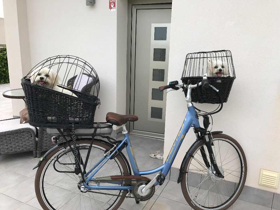 Nu har jag inhandlat hundkorgar till min el-cykel. Jag hade beställt en att ha bak på. Fick inte på den. Tycker inte om att inte klara av saker, men fick bita i det sura åpplet och åka ner, eller cykla ner till cykelaffären. Det gladde mig en del att se att inte de heller klarade av det. De fick byta skruvarna, då de tog emot om man skulle få den på pakethållaren. Det tog dem nog en timme eller så. När jag stod där så såg jag dock också att det inte skulle gå att ha båda hundarna i den, även om den var relativt stor. Valet mellan att skaffa mig två yorkshireterrier eller behålla mina två malteser blev att jag fick en hundkorg fram och en bak.
