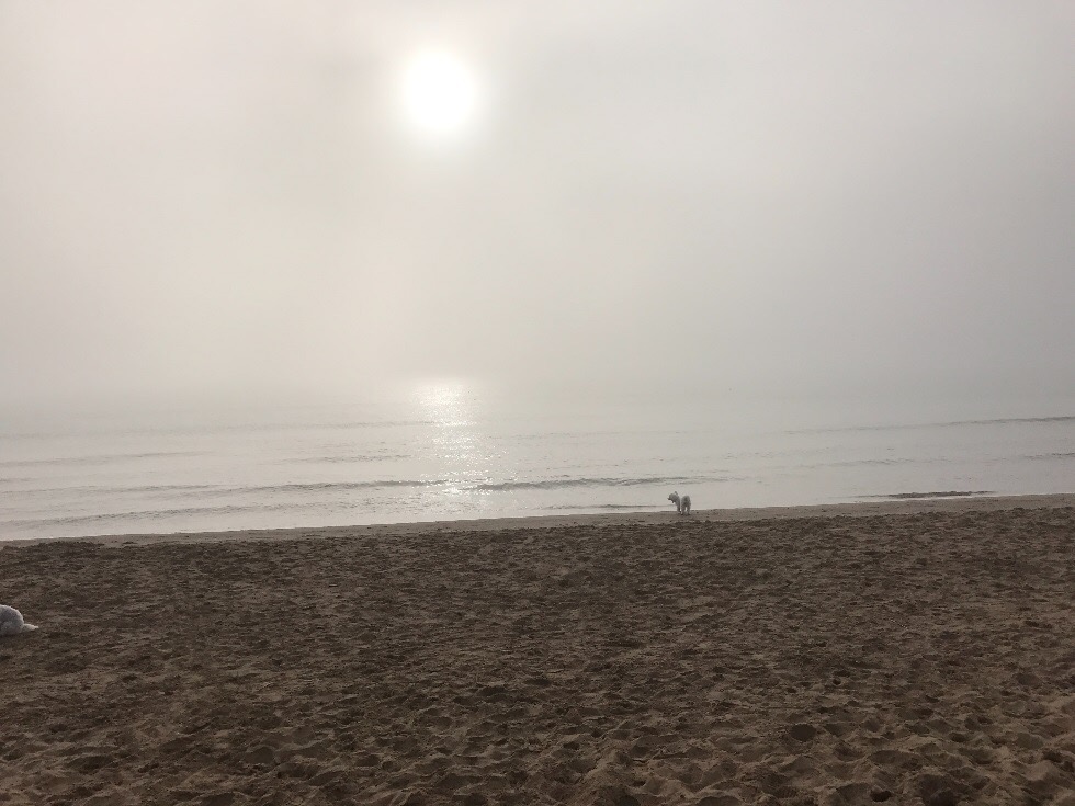 Dimma på stranden, ser knappt solen.